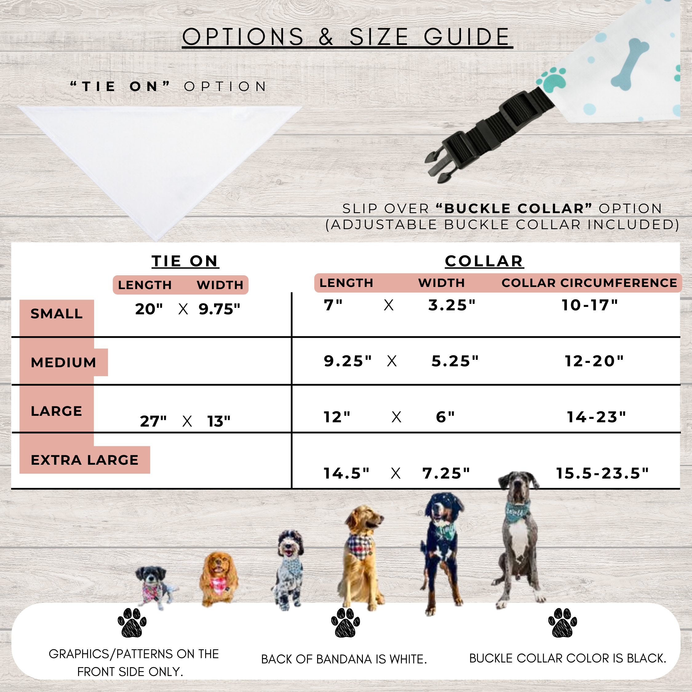 Be sure to refer to our size guide above to choose the perfect size for your pet. Our bandanas come in two sizes: 20" × 9.75" (50.8 × 24.8 cm) and 27" × 13" (68.6 × 33.0 cm), with a sewn-in label for added convenience. As pre-constructed items, size may vary by +/- 1" (2.5 cm).