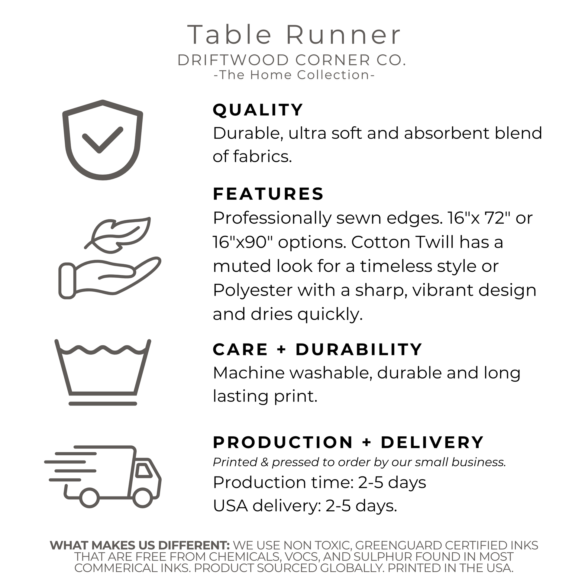 Each table runner is made to order and showcases exclusive design work by Driftwood Corner Co. With high-quality DTF or Sublimation printing methods, our table runners are printed and pressed to perfection, ensuring a beautifully crafted final product. Our premium printing techniques bring your design to life, whether you're looking for a classic muted finish or a vibrant, dynamic look.